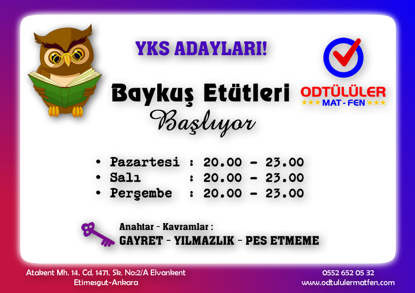 -Psiko-sosyal yönden sağlam ve güçlü bireyler yetiştirmesidir. İşte bu bağlamda ODTÜLÜLER MAT-FEN kurumlarda 20.00-23.00 arası ek soru çözümleri, konuların pekiştirilmesi ve varsa eksiklerini en aza indirgemek amacıyla mayıs ayı başında BAYKUŞ ETÜTLERİNİ başlatacaktır.